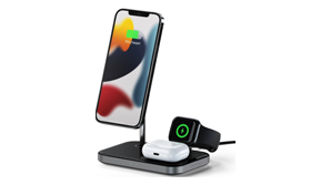 iPhoneを立て掛けて充電しながら動画視聴も可能。重量級のPro Maxでも安定して支える高品質な台座です。