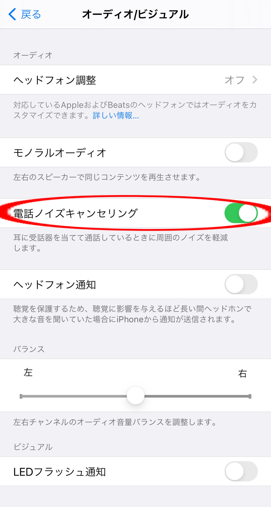 【設定】→【アクセシビリティ】→【オーディオ/ビジュアル】→【電話ノイズキャンセリング】