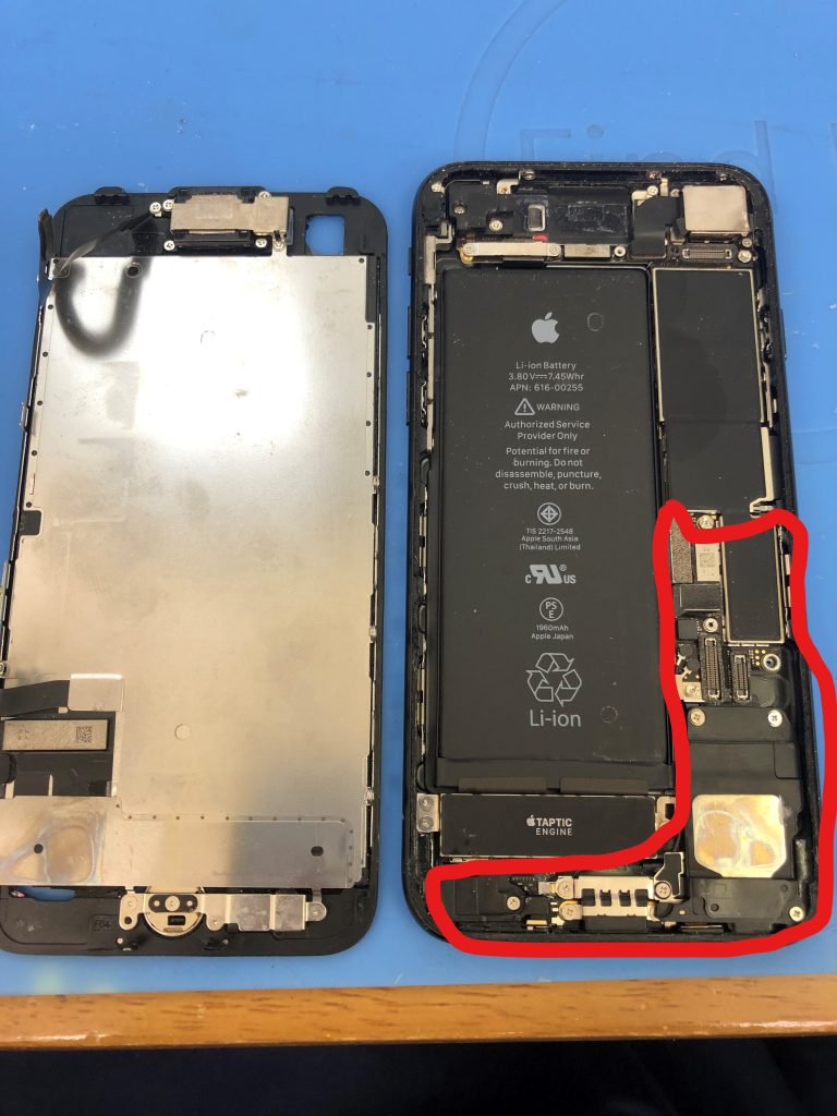 こちらは、iPhone7になりますが、ライトニングの上に、基盤、ラウンドスピーカーが乗っかっています。