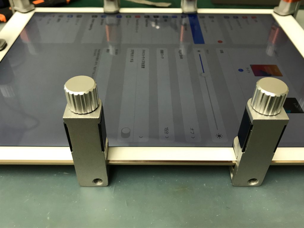 iPadの修理は、まず温めてガラスを固定している粘着を緩めます。端末を開ける際は、ガラスに気をつけるのはどの機種でも同様ですが、iPad Pro 12.9インチのようにガラスと液晶が一体型になっている場合、ガラスのすぐ裏側に付いている液晶を傷つけないようにさらに注意が必要です。