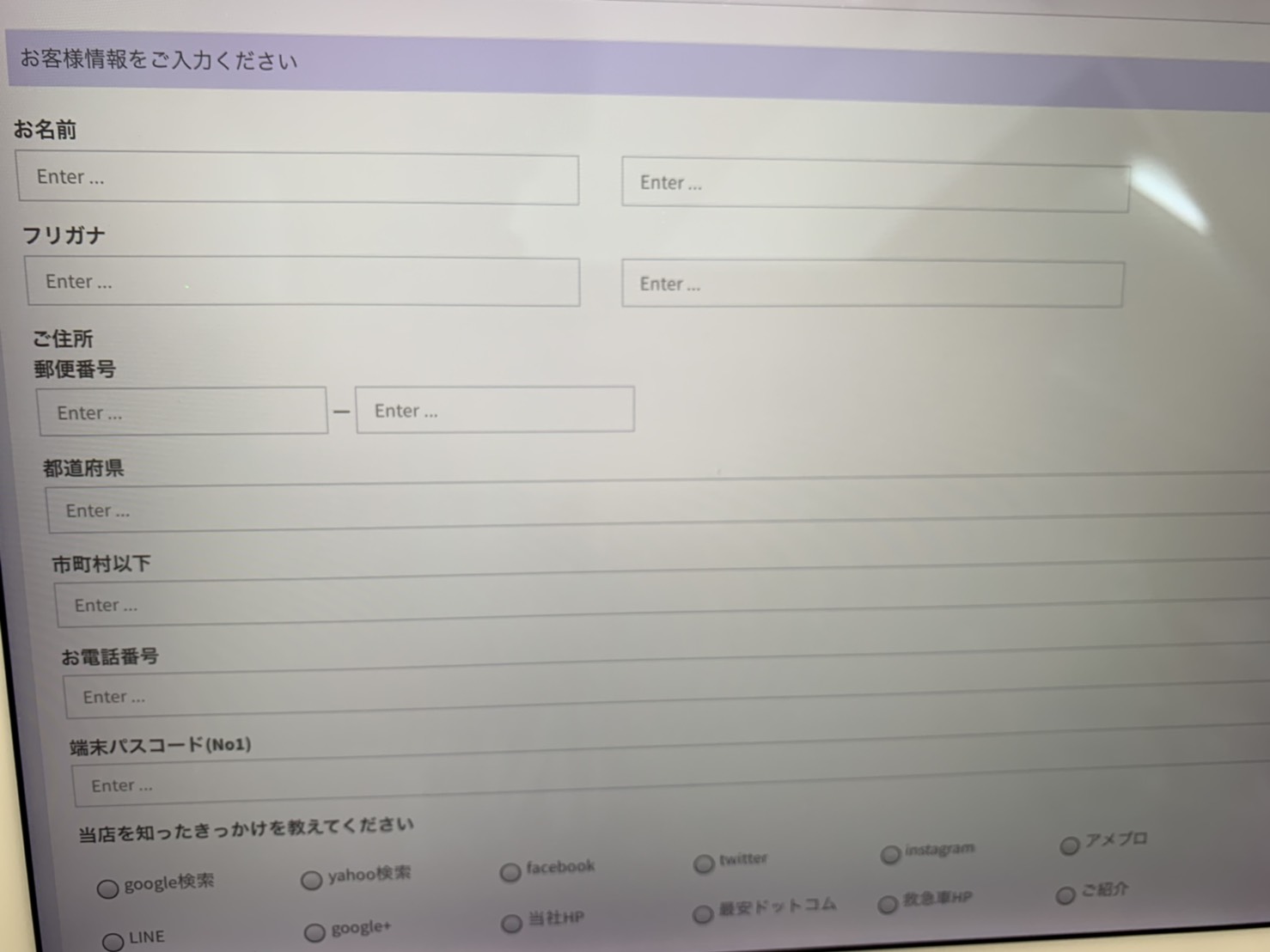 まずは専用の受付iPadに簡単な、お客様情報をご記入いただきます。