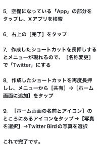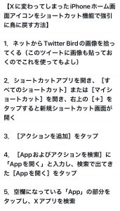 こんにちは。 先日から私もiPhoneからTwitterがXになり鳥さんがいなくなり 少し寂しいなと思っていたところ、なんと鳥さんを戻す方法というのを見つけやってみました! と言ってもXを戻すのではなくショートカットを使いXとは別に作るという感じです。