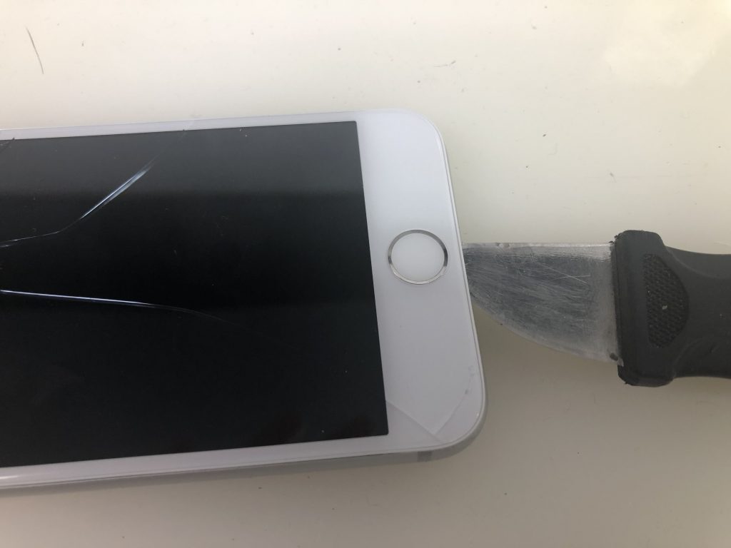 ホームボタンのケーブルが通っていない場所に隙間があるため、刃を入れてゆっくりと剥がします。