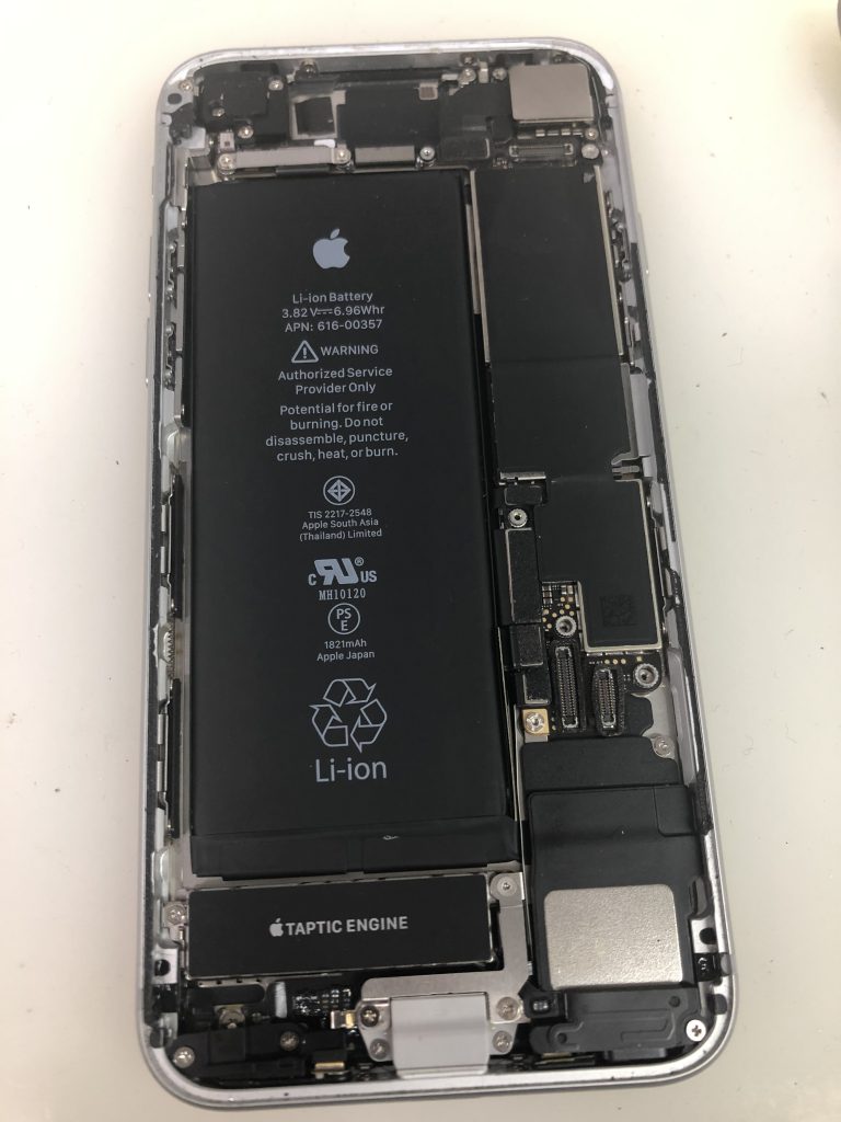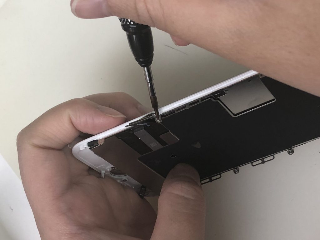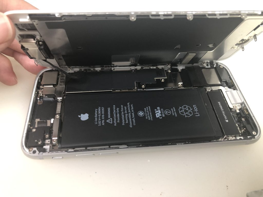 まずはパネルを支えているペンタローブネジ(星ネジ)を取り、部品を壊さないように慎重に開けていきます。6Sから周りに強い粘着が貼られている為、無理に剥がそうとするとすぐにコネクタを壊してしまったりします。