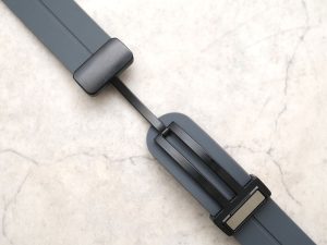 1度、長さ調節するとワンタッチで着脱ができるマグネット式のDバックルが採用されていて