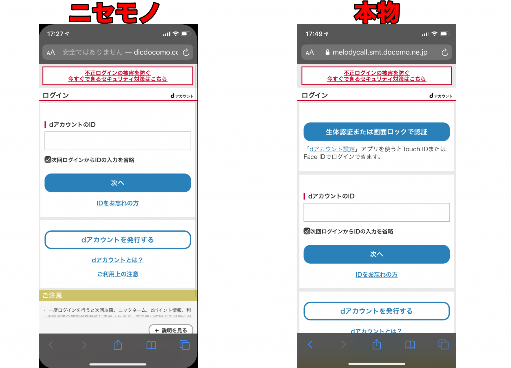 本物と見比べてみると、まずアドレスがよくわからないものになっていて怪しさ全開です。ページレイアウト自体はまあよくできてはいます。特徴としては偽のページで生体認証ができないことです。でしょうね…。