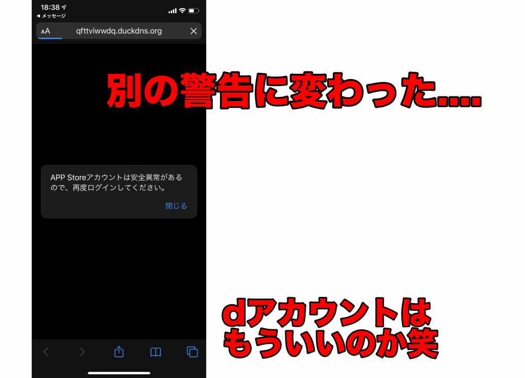 さらに最初から同じSMSリンクに飛んでみると今度はApp Storeのアカウントに関する警告に変わっていました。もはや何でもあり状態です。