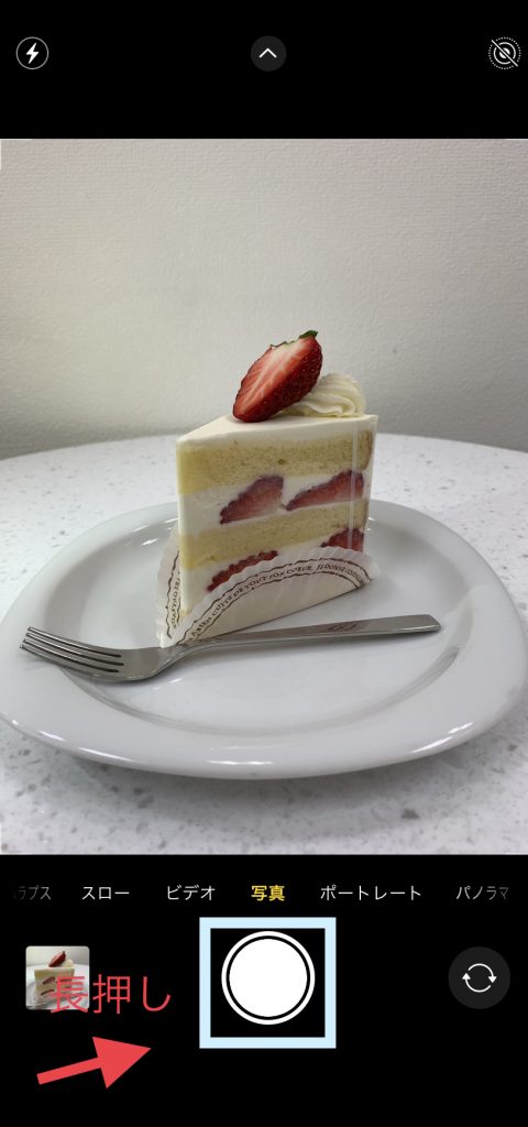 iPhoneのカメラアプリを起動した後シャッターボタンを長押しします。
