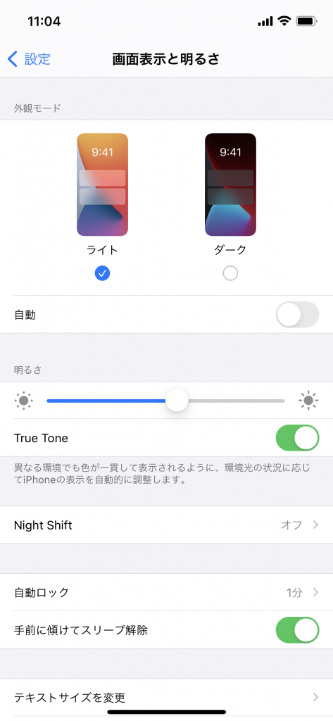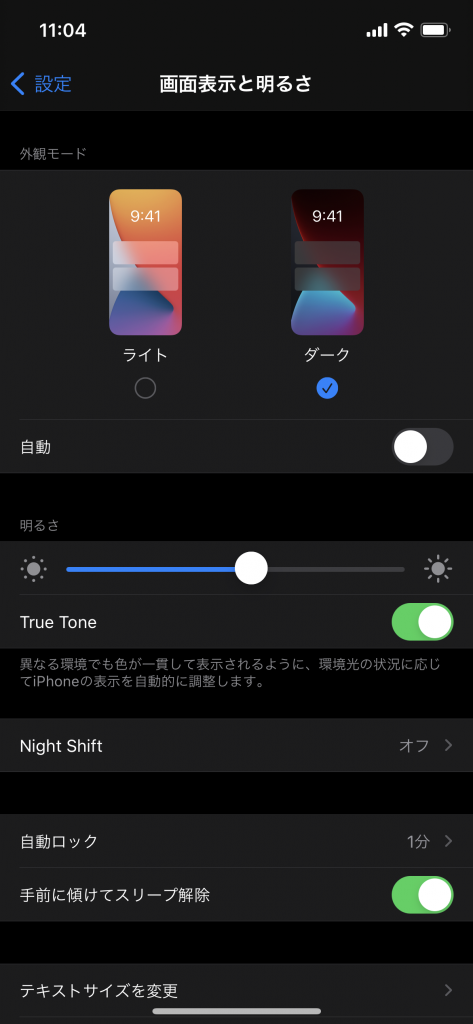 iOS 13から機能でダークモードとライトモードが設定⇨画面表示と明るさから