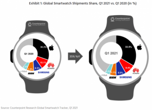 2021年第1四半期の統計で、AppleWatchがシェア33.5%を獲得し、第一位になったとのことです。