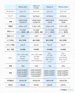 iPhone14 / 14Plus / 14Pro / 14ProMAX の4種類が発表され、そのうちiPhone14Pro/14ProMAXは、iPhoneXから続いていた画面上部のノッチがなくなり、最新のA16Bionicを搭載、カメラの画素も4800万画素まで引き上げられました。