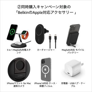Amazon.co.jpで指定のApple製品と、対象のBelkin製品を同時に購入すると、Belkin製品が15%オフになるキャンペーンになっています。