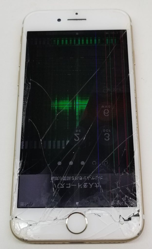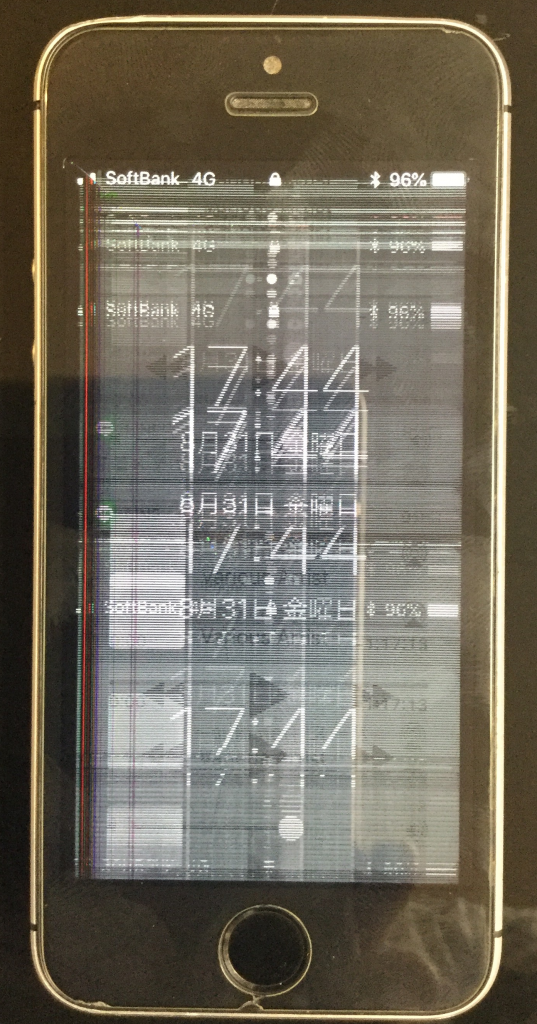 次に、iPhone5sの液晶破損事例です。 画面の表示が乱れており、操作が全くできない状態でした。画像が乱れている場合、液晶だけでなく内部で誤作動が起きている可能性もあります。