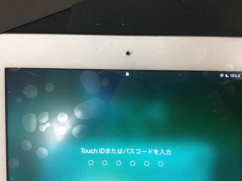 インカメラ周辺を中心にガラス表面にヒビが広がっている状態でiPad6をお持ち込みいただきました。