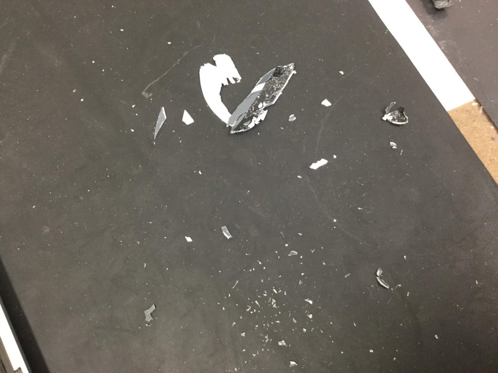 前途した割れたガラスの破片にも注意をしながら作業を進めていきます。
