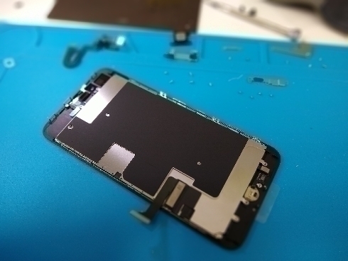 端末をお預かりさせていただき画面を開け、軽く清掃、新しい画面を仮付けて動作チェック…タッチ映りに問題がなかったため、画面を固定して修理完了です!