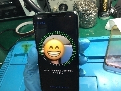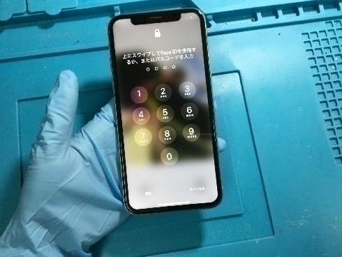 稀にパスコード入力画面まで行く時があったそうですが、「このiPhoneでFace IDをアクティベートできません」という警告が表示されていたそうです。開けてみるとFace IDのパーツの一部が水濡れで腐食していてiPhoneの正常な起動を妨げていました。修理後はデータも操作も復活して顔認証もできるようになりました。iPhoneXsは繊細なのでちょっとした水濡れでも注意です。