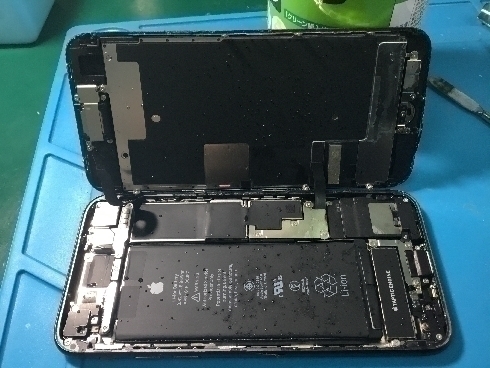 基盤洗浄、液晶交換にて起動に成功。ホームボタンは壊れてしまっていましたが、