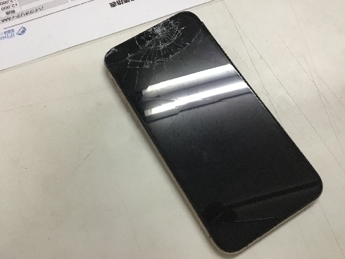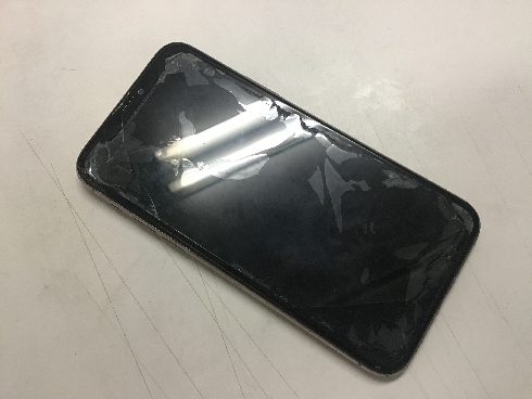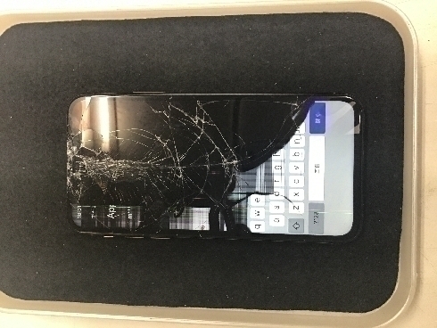 機種はiPhone Xs、中央部が縦にヒビが入り7割ほどが液晶漏れで黒くなってしまって、タッチも効かず画面も動かない状態です。
