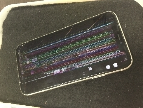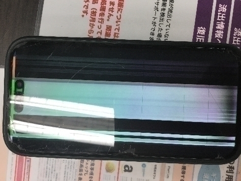 画面上部にひび割れがあり、その箇所から下部に向けてカラフルな線も出ているため液晶も破損してしまっている状態です。