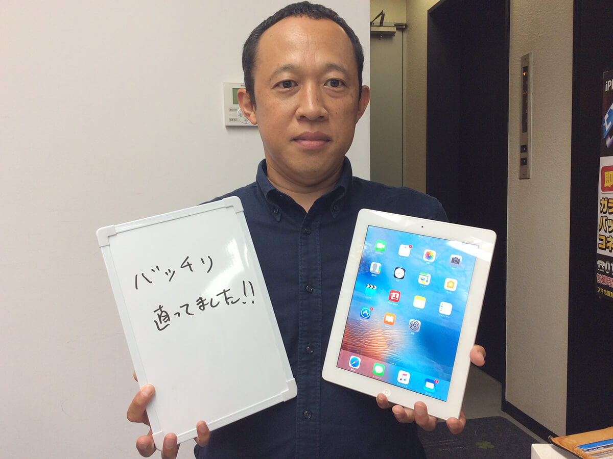 修理後の端末操作に不具合などがないか、入念に動作チェックを行っております。今回のiPad4のガラス割れ修理につきましても今後も安心してお使い頂けるようにしっかりと修理させて頂きました。また故障でお困りの際は、当店にご相談ください。