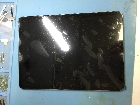 本体側には濡れた形跡は無いものの、画面裏には白い粉のようなものが全体に広がっています。
